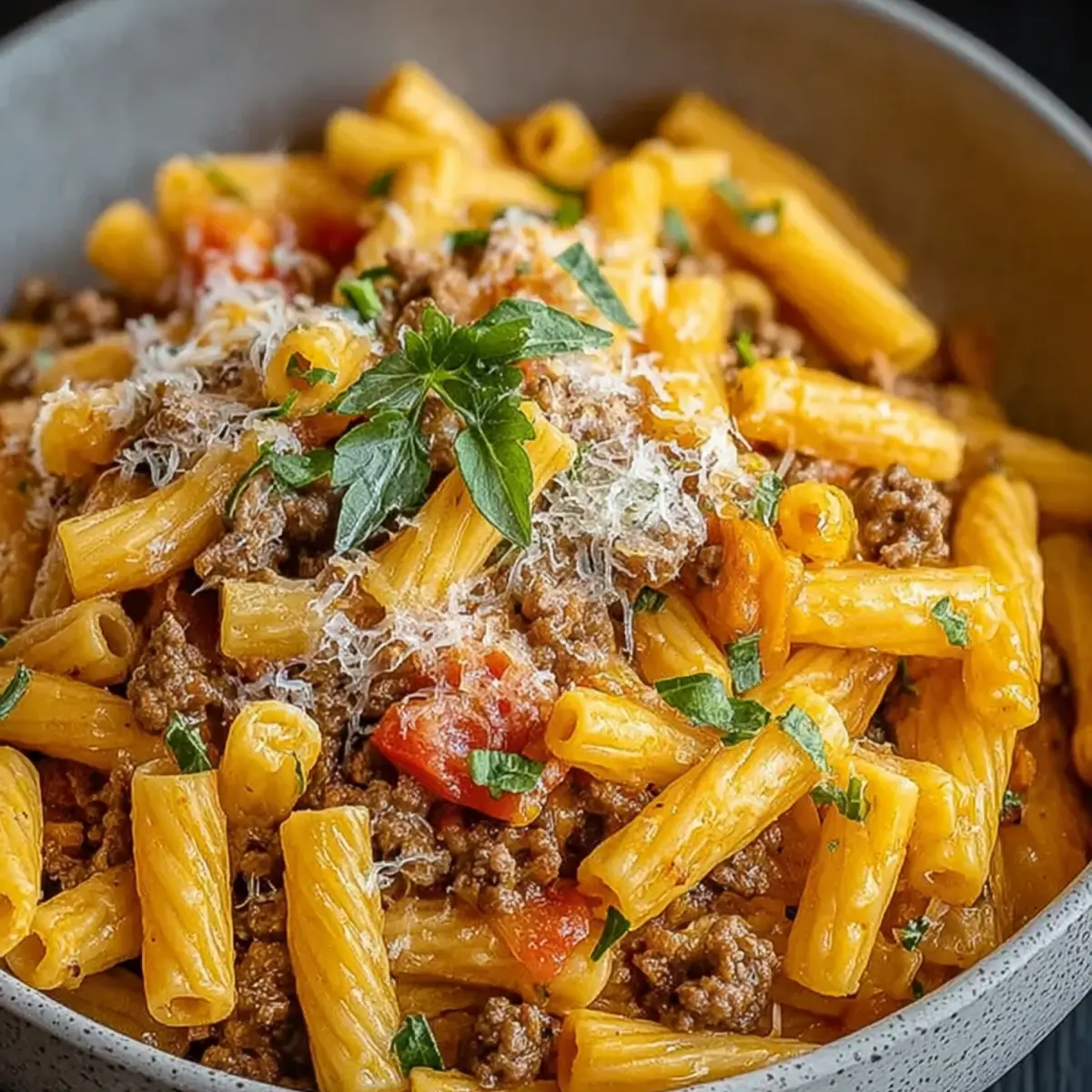 Die Cheeseburger Pasta ist eine echte Einladung an alle Sinne. Schon beim Anrichten merkst du: Hier wird nicht gekleckert, sondern gejubelt. Die Sauce legt sich wie ein warmer Mantel um jede Nudel, alles glänzt weich und cremig. Erst beim Umrühren siehst du, wie die Käsefäden sich ziehen, wie sich Tomatenrot, das Gold des Cheddar und winzige Petersilienfetzen mischen.