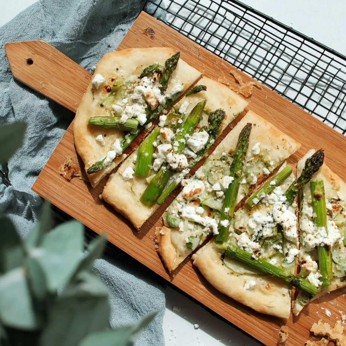 Was macht diesen Flammkuchen mit grünem Spargel und Feta so besonders